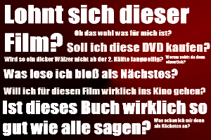 Und um diesem "Lohnt sich das?"-Gefühl eine persönliche und vielleicht zur Entscheidung verhelfende Meinung zu geben schaue ich mir Filme und Bücher für euch an und schreibe ob sich das lohnt und wenn ja für wen.